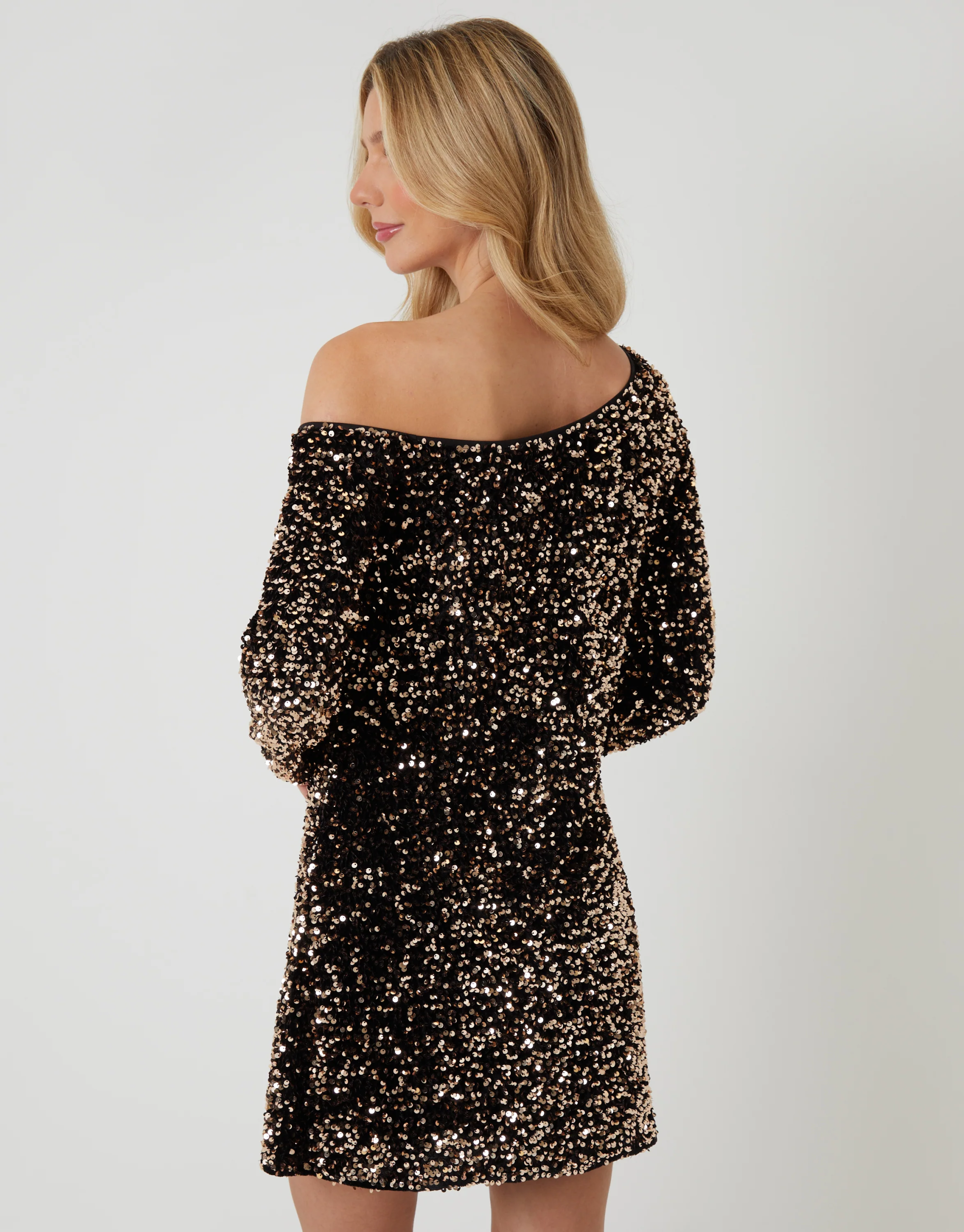 Orilen Women’s Bronze Sequin Velour Slash Neck Mini Dress
